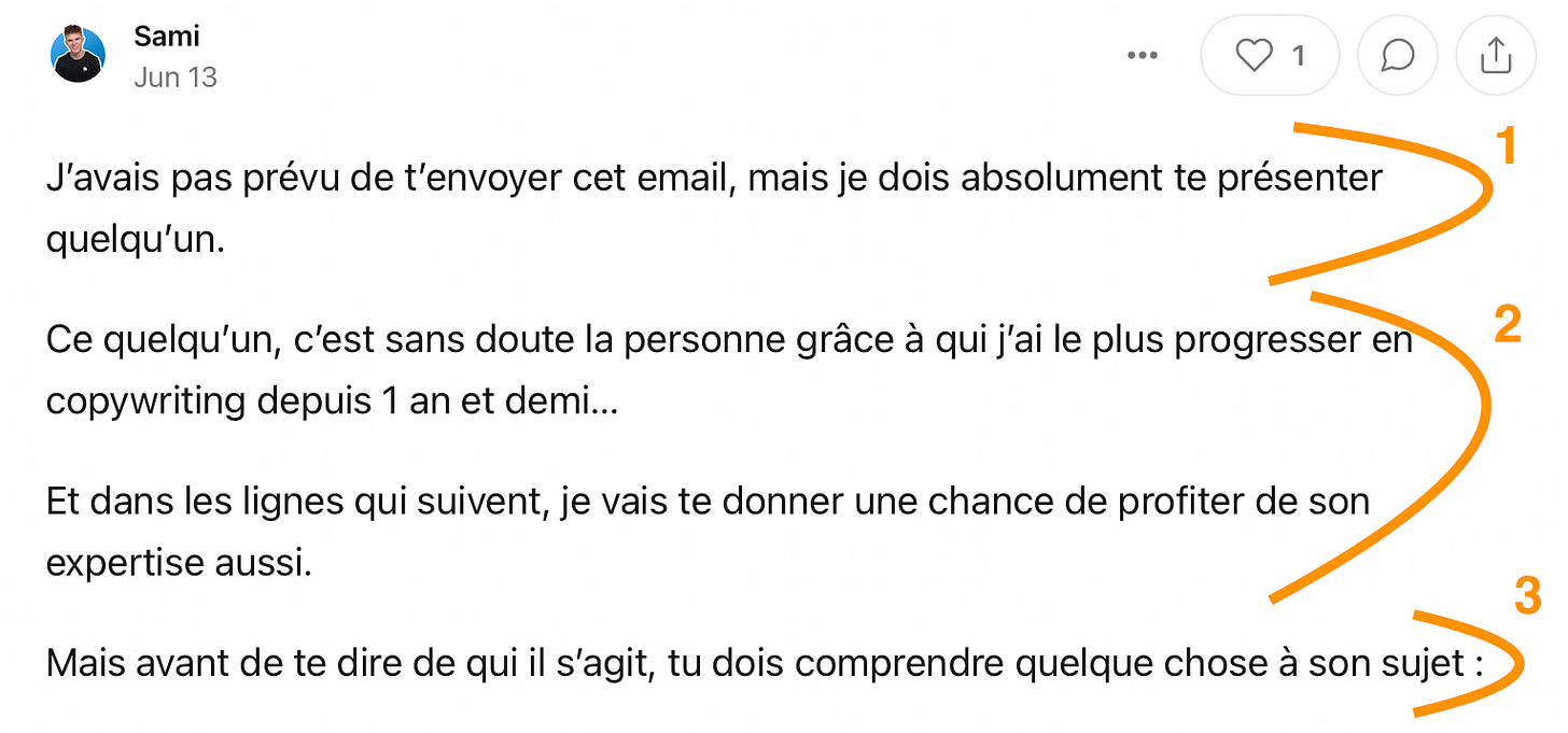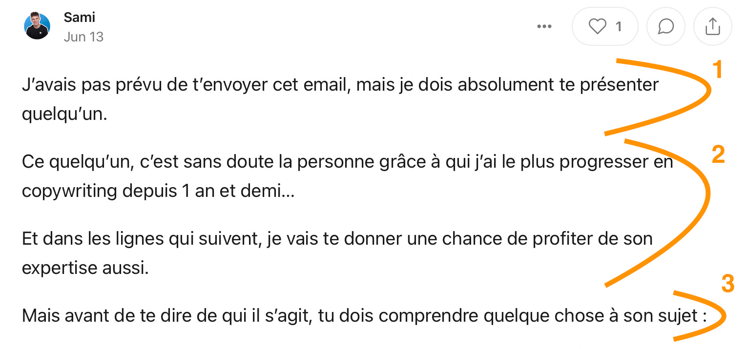 Tu comprends que la personne que je veux te présenter peut te faire progresser en copywriting, mais tu as encore besoin d’en savoir plus (et donc d’ouvrir le mail).