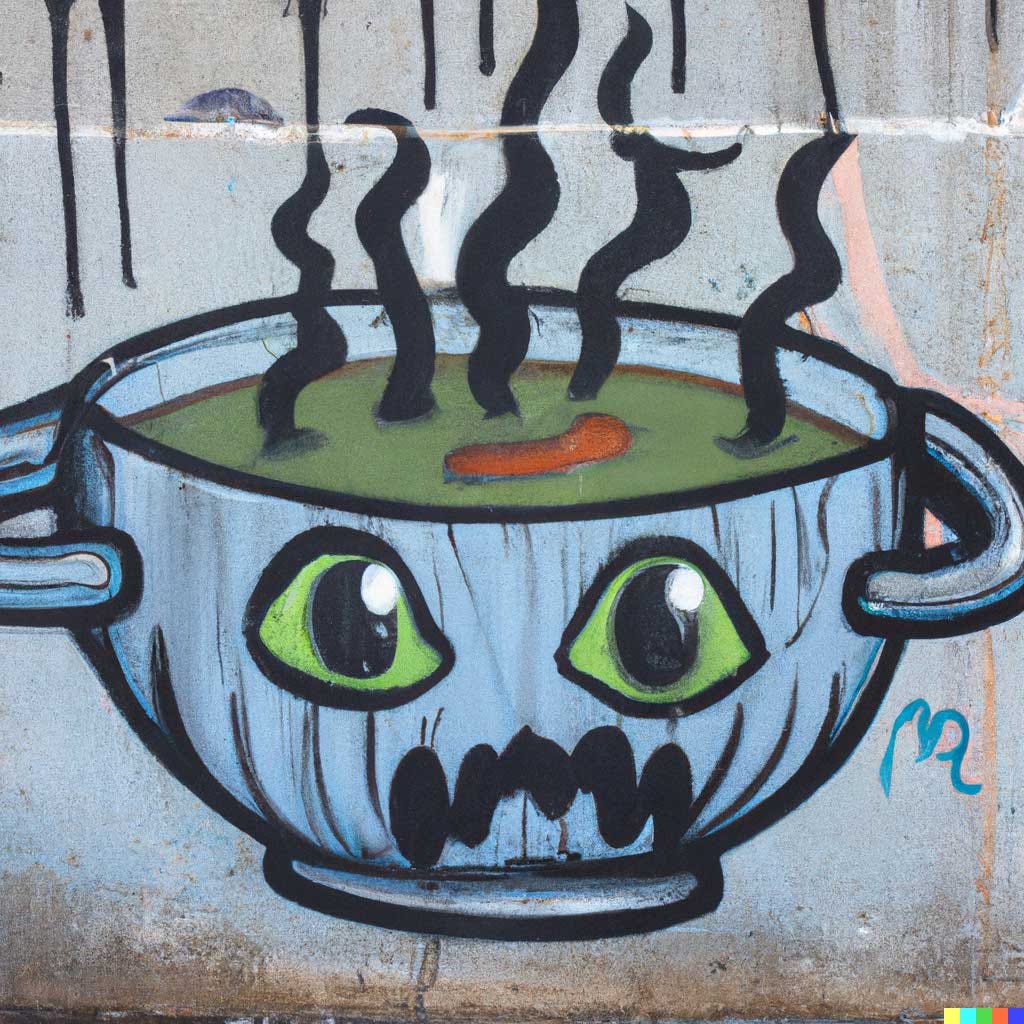 Tu dis à Dall-E que tu aimerais un tableau qui représente : "un bol de soupe qui ressemble à un monstre, le tout en graffiti mural" et voilà le travail :